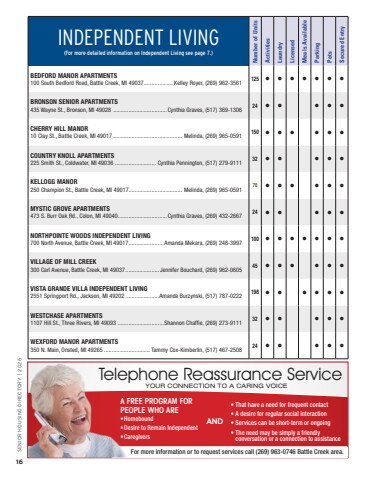 INDEPENDENT LIVING(For more detailed information on Independent Living see page 7.) Number of Units Activities Laundry Licensed Meals Available Parking Pets Secured EntryBEDFORD MANOR APARTMENTS100 South Bedford Road, Battle Creek, MI 49037................... Kelley Royer, (269) 962-3561 125 %u2022 %u2022 %u2022 %u2022 %u2022 %u2022 %u2022BRONSON SENIOR APARTMENTS435 Wayne St., Bronson, MI 49028 ...................................Cynthia Graves, (517) 369-1306 24 %u2022 %u2022 %u2022 %u2022 %u2022CHERRY HILL MANOR10 Clay St., Battle Creek, MI 49017 ............................................. Melinda, (269) 965-0591 150 %u2022 %u2022 %u2022 %u2022 %u2022 %u2022COUNTRY KNOLL APARTMENTS225 Smith St., Coldwater, MI 49036 ........................... Cynthia Pennington, (517) 279-9111 32 %u2022 %u2022 %u2022 %u2022 %u2022KELLOGG MANOR250 Champion St., Battle Creek, MI 49017................................... Melinda, (269) 965-0591 70 %u2022 %u2022 %u2022 %u2022 %u2022 %u2022MYSTIC GROVE APARTMENTS473 S. Burr Oak Rd., Colon, MI 49040................................Cynthia Graves, (269) 432-2667 24 %u2022 %u2022 %u2022 %u2022 %u2022NORTHPOINTE WOODS INDEPENDENT LIVING700 North Avenue, Battle Creek, MI 49017.......................Amanda Mekara, (269) 248-3997 100 %u2022 %u2022 %u2022 %u2022 %u2022 %u2022 %u2022VILLAGE OF MILL CREEK300 Carl Avenue, Battle Creek, MI 49037...................... Jennifer Bouchard, (269) 962-0605 45 %u2022 %u2022 %u2022 %u2022 %u2022 %u2022VISTA GRANDE VILLA INDEPENDENT LIVING2551 Springport Rd., Jackson, MI 49202 ......................Amanda Burzynski, (517) 787-0222 198 %u2022 %u2022 %u2022 %u2022 %u2022 %u2022WESTCHASE APARTMENTS1107 Hill St., Three Rivers, MI 49093 ..............................Shannon Chaffie, (269) 273-9111 32 %u2022 %u2022 %u2022 %u2022 %u2022WEXFORD MANOR APARTMENTS350 N. Main, Onsted, MI 49265 .............................. Tammy Cox-Kimberlin, (517) 467-2508 24 %u2022 %u2022 %u2022 %u2022 %u2022For more information or to request services call (269) 963-0746 Battle Creek area.Telephone Reassurance ServiceYOUR CONNECTION TO A CARING VOICEA FREE PROGRAM FOR PEOPLE WHO ARE %u2022 Homebound %u2022 Desire to Remain Independent %u2022 CaregiversAND%u2022 That have a need for frequent contact%u2022 A desire for regular social interaction%u2022 Services can be short-term or ongoing%u2022 The need may be simply a friendly conversation or a connection to assistance SENIOR HOUSING DIRECTORY | 202616
