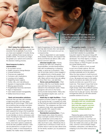 Don%u2019t delay the conversation. Talk sooner rather than later when a crisis has occurred. As an example, if you know you have poor eyesight or trouble driving at night, address those issues before a problem arises. The sooner you begin, the greater your options and control in the decision making process. Good reasons to start a conversation:%u2022 An accident occurs.%u2022 Health concerns change lifestyle. %u2022 Unusual behaviors.%u2022 Finances are neglected. %u2022 Confusion with medications.%u2022 Loosing a lot of weight.%u2022 Neglecting basic hygiene.%u2022 Clutter, bills, and mail pilling up.%u2022 Appears in inappropriate clothing.%u2022 Missing appointments.%u2022 Forgetfulness becomes dominant.%u2022 Signs of depression.%u2022 Care needs exceed manageability.%u2022 Safety becomes an issue.Seek out innovative solutions. Products that can help with activities of daily living (ADL) can help aging adults stay at home longer. That could be something that provides reminders for taking medication on time; eating regularly; being as active as possible; or even supports for living in the household such as grab bars in the bathroom, easy to use handles on doors, entryways, and more. Providing for services to come into the home can also help. In addition to care brought into the home, short-term options outside the home are also possible solutions. Care can be planned for a couple of hours one day a week or more frequently as needed. No matter what, it includes a level of supervision for the care receiver but may also include other care specific to the needs of the loved one such as companionship. Much is dependent on care needed, time needed, finances, and support that family and friends are able to offer. Let%u2019s look at common options: Informal respite care %u2013 Family or friends can take over caregiving responsibilities, provide transportation, help with housekeeping or preparing meals, or serve as a companion. They can sit and play cards or even engage in fun neighborhood or family gossip. It all depends on what they are comfortable with. Many will do more if you are willing to show them how. Just ask them. Home care professionals %u2013 Paid providers offer the most flexible respite care with their hours and services tailored to the individual%u2019s needs. These caregivers will come to the home. Some provide transportation. Many also offer specialized respite care, such as dementia care.Adult day or night facilities %u2013 These programs provide a place for aging adults to go during the day, or possibly any shift, so that they are supervised and get social interaction. The caregivers can then work or attend to their other responsibilities. More specific ADL support is also available when planned for. Residential communities %u2013 If you need respite care where the person stays overnight outside of the home, many residential communities from independent to skilled nursing facilities offer short-term care. Oftentimes this is a great way to introduce a loved one to another level of care but also allows time for the family vacation you%u2019ve passed on for years. Emergency respite %u2013 Is needed when a the primary caregiver has been injured or is ill. Miles for Memories offers a short-term solution to a potentially long-term need for the person living with dementia until a long-term care solution is developed. Your Area Agency on Aging, Commission on Aging, or existing MI Choice Waiver or PACE Program can also be a great starting point. There is no reason to limit yourself to just one of these options. But one caution would be to introduce new care providers gradually and to be patient. Allow the care receiver to build trust and understand that this is necessary for both of you. Be aware and open to the reality that not all options are viable and not all respite providers are a good fit for your loved one. That doesn%u2019t mean that home care, as an example, is off the table, it might simply mean that a different person might be a better fit; maybe an aide that knows how to play gin rummy. And when emergencies arise you will have several possible solutions to turn to. Look for answers that optimize strengths and can compensate for challenges and concerns. Add only the support services that are required to continue to live as independently as possible.Reassuring aging adults that they are loved and that you share their goals will do wonders for coming to an agreement that gives everyone peace of mind. No matter who ends up with what roles, common communication keeps frustration, exhaustion, and distrust from creeping in at a time when everyone is needed.There are steps those needing care as well as the caregivers can take this year to make sure no one becomes a shut-in statistic.SENIOR HOUSING DIRECTORY | 202639