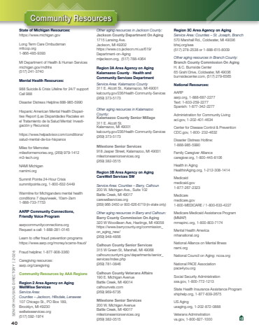 Community ResourcesRegion 3C Area Agency on AgingService Area: Counties %u2013 St. Joseph, Branch570 Marshall Rd., Coldwater, MI 49036bhsj.org/aaa(517) 278-2538 or 1-888-615-8009 Other aging resources in Branch County:Branch County Commission On AgingH. & C. Burnside Center65 Grahl Drive, Coldwater, MI 49036burnsidecenter.com, (517) 279-6565National Resources:AARP aarp.org, 1-888-687-2277Text: 1-833-259-2277Spanish: 1-877-342-2277Administration for Community Livingacl.gov, 1-202-401-4634Center for Disease Control & PreventionCDC.gov, 1-800- 232-4632Disaster Distress Hotline:1-888-985-5990Family Caregiver Alliancecaregiver.org, 1-800-445-8106Health in AgingHealthinAging.org, 1-212-308-1414Medicaidmedicaid.gov1-877-267-2323Medicaremedicare.gov1-800-MEDICARE / 1-800-633-4227Medicare Medicaid Assistance Program (MMAP) mmapinc.org, 1-800-803-7174Mental Health America mhanational.orgNational Alliance on Mental Illnessnami.orgNational Council on Aging: ncoa.orgNational PACE Association pace4you.orgSocial Security Administration ssa.gov, 1-800-772-1213State Health Insurance Assistance Programshiphelp.org, 1-877-839-2675US Agingusaging.org, 1-202-872-0888Veterans Adminstrationva.gov, 1-800-827-1000State of Michigan Resources:https://www.michigan.govLong Term Care Ombudsmanmltcop.org1-866-485-9393MI Department of Health & Human Services michigan.gov/mdhhs (517) 241-3740Mental Health Resources:988 Suicide & Crisis Lifeline for 24/7 supportCall 988Disaster Distress Helpline 888-985-5990Hispanic American Mental Health Disparities Report (Las Disparidades Raciales en el Tratamiento de la Salud Mental: Investigaci%u00f3n y Recursos)https://www.helpadvisor.com/conditions/salud-mental-de-los-hispanosMiles for Memoriesmilesformemories.org, (269) 979-1412m3-tech.orgNAMI Michigannamimi.orgSummit Pointe 24-Hour Crisissummitpointe.org, 1-800-632-5449Warmline for Michiganders mental health conditions 7 days/week, 10am-2am1-888-733-7753AARP Community Connections, Friendly Voice Programaarpcommunityconnections.org Request a call: 1-888-281-0145Learn to offer fraud prevention programs https://www.aarp.org/money/scams-fraud/Fraud helpline: 1-877-908-3360 Caregiving resources:aarp.org/caregivingCommunity Resources by AAA RegionsRegion 2 Area Agency on Aging WellWise ServicesService Area: Counties %u2013 Jackson, Hillsdale, Lenawee107 Chicago St., PO Box 189, Brooklyn, MI 49230wellwiseservices.org(517) 592-1974Other aging resources in Jackson County:Jackson County Department On Aging1715 Lansing Ave.Jackson, MI 49202https://www.co.jackson.mi.us/619/Department-on-Agingmijackson.org, (517) 788-4364Region 3A Area Agency on Aging Kalamazoo County - Health and Community Services DepartmentService Area: Kalamazoo County311 E. Alcott St., Kalamazoo, MI 49001kalcounty.gov/236/Health-Community-Services(269) 373-5173Other aging resources in Kalamazoo County:Kalamazoo County Senior Millage311 E. Alcott St.Kalamazoo, MI 49001kalcounty.gov/236/Health-Community-Services(269) 373-5173Milestone Senior Services918 Jasper Street, Kalamazoo, MI 49001milestoneseniorservices.org(269) 382-0515Region 3B Area Agency on AgingCareWell Services SWService Area: Counties %u2013 Barry, Calhoun200 W. Michigan Ave., Suite 102Battle Creek, MI 49017carewellservices.org(269) 966-2450 or 800-626-6719 (in-state only)Other aging resources in Barry and Calhoun:Barry County Commission On Aging320 W Woodlawn Ave, Hastings, MI 49058https://www.barrycounty.org/commission_on_aging_new/(269) 948-4856Calhoun County Senior Services315 W Green St, Marshall, MI 49068calhouncountymi.gov/departments/senior_services/index.php(269) 781-0846Calhoun County Veterans Affairs190 E. Michigan AvenueBattle Creek, MI 49014calhounvets.com(269) 969-6735Milestone Senior Services200 W. Michigan AvenueBattle Creek, MI 49017milestoneseniorservices.org(269) 382-0515SENIOR HOUSING DIRECTORY | 202640