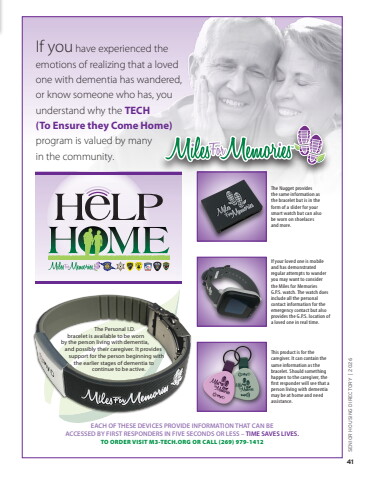If you have experienced the emotions of realizing that a loved one with dementia has wandered, or know someone who has, you understand why the TECH (To Ensure they Come Home)program is valued by many in the community.EACH OF THESE DEVICES PROVIDE INFORMATION THAT CAN BE ACCESSED BY FIRST RESPONDERS IN FIVE SECONDS OR LESS %u2013 TIME SAVES LIVES.If your loved one is mobile and has demonstrated regular attempts to wander you may want to consider the Miles for Memories G.P.S. watch. The watch does include all the personal contact information for the emergency contact but also provides the G.P.S. location of a loved one in real time.This product is for the caregiver. It can contain the same information as the bracelet. Should something happen to the caregiver, the first responder will see that a person living with dementia may be at home and need assistance.The Nugget provides the same information as the bracelet but is in the form of a slider for your smart watch but can also be worn on shoelaces and more.TO ORDER VISIT M3-TECH.ORG OR CALL (269) 979-1412 The Personal I.D. bracelet is available to be worn by the person living with dementia, and possibly their caregiver. It provides support for the person beginning with the earlier stages of dementia to continue to be active. SENIOR HOUSING DIRECTORY | 202641