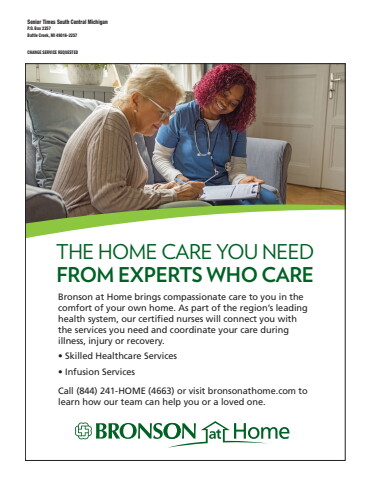 Senior Times South Central MichiganP.O. Box 2257Battle Creek, MI 49016-2257CHANGE SERVICE REQUESTEDTHE HOME CARE YOU NEEDFROM EXPERTS WHO CAREBronson at Home brings compassionate care to you in the comfort of your own home. As part of the region%u2019s leading health system, our certified nurses will connect you with the services you need and coordinate your care during illness, injury or recovery.%u2022 Skilled Healthcare Services%u2022 Infusion ServicesCall (844) 241-HOME (4663) or visit bronsonathome.com to learn how our team can help you or a loved one.