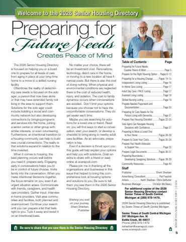 Be sure to share that you saw them in the Senior Housing DirectoryTable of Contents PagePreparing for Future Needs Creates Peace of Mind ............................ Page 5Prepare for the Right Housing Option ... Pages 6-13Preparing for a Housing Change ........ Pages 14-15Independent Living Listing ........................ Page 16In-Home Care Listing ............................... Page 17Adult Day Care / PACE Listing .................. Page 17Assisted Living Listing ............................. Page 18Skilled Nursing Listing ............................. Page 19Prepare Needed Paperwork and Documentation .................................... Page 20Preparing for Care Needs for the Person Living with Dementia................. Page 21Prepare Your Housing Checklist ......... Pages 22-25Solo Agers Can Navigate Housing Decisions with Confidence.................... Page 27Preparing to Move a Loved One to Your Home ............................... Pagse 28-29Prepare to Cover Your Costs .............. Pages 30-34Prepare Your Health Advocate to Support You ..................................... Page 35Prepare Legal Documents ................. Pages 36-37Preparing Boundaries %u2013 Developing Caregiving Solutions .... Pages 38-39Community Resources.............................. Page 40StaffPublisher ................................ Sherii SherbanAdvertising Consultant................... Pat Fosdick Artists............... Keith Sherban / Rick DeRuiterBusiness Manager .............. Christyn McClearyFor additional copies of the 2026 Senior Housing Directory contact Senior Times of South Central Michigan at (269) 979-1479.2026 Senior Housing Directory is published by Senior Times of South Central Michigan.Senior Times of South Central Michigan247 Michigan Ave. W.Battle Creek, MI 49017Phone (269) 979-1479ssherban@scenepub.comwww.scenepub.comThe 2026 Senior Housing Directory is focused on helping you or a loved one to prepare for all levels of care from aging in place at your long-time home to a move to a skilled nursing facility. Oftentimes the reality of determining care needs is focused on the solo ager; a person that now lives alone or that may have extended family not living in the area to support them. Solutions for the solo ager could include building a social and community network but also developing connections by bringing programs and services into the home, joining a senior center or other group with similar interests, or even volunteering. Furthermore, an intentional transition to a housing community can help to build new crucial connections. The reality is that solutions expand in relation to the time invested. When it comes to housing, the best planning occurs well before you need it; prepare early. Engaging early in conversations helps you to be in control of future choices. Invite family into the conversation. When you make intentional decisions together, the focus remains on you, even if an urgent situation arises. Communicate with friends, caregivers, and health care providers. Gather input. Interview in-home providers. Visit area communities and facilities, both planned and unannounced. Continue your search until you can prepare a list that feels right to you. Tuck it away and revisit it on an intentional basis. No matter your choice, there will be an investment cost. Renovations, technology, direct care in the home, or moving to a new location all have financial costs. But there is also the cost of doing nothing. When physical and environmental conditions are neglected there is the cost of reduced health, injury, and isolation. The cost to family dynamics occurs when conversations are avoided. Don%u2019t limit your options because you choose not to have the uncomfortable conversations. They do get easier each time. Maybe you are searching for solutions for a loved one or friend. Read on; you will find ways to start a conversation, start your search, or develop a checklist to bring along to nearby adult care facilities. As an advocate, preparation is key. Even if a decision is thrust upon you this guide will help explain your options and help you with solutions. Grab an extra to share with a friend or read online at scenepub.com.Please join me in thanking all the organizations and businesses in this issue that helped to bring this comprehensive look at housing options and solutions to you. Be sure to tell them you saw them in the 2026 Senior Housing Directory.Wishing you well on your journey, Sherii Sherban, PublisherPreparing forFuture NeedsCreates Peace of MindWelcome to the 2026 Senior Housing DirectorySENIOR HOUSING DIRECTORY | 20265
