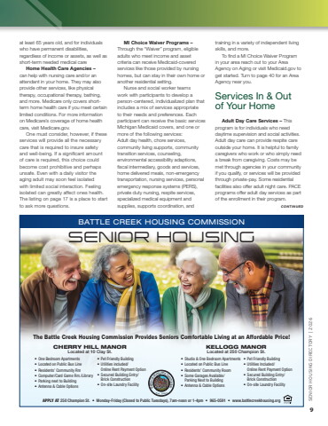 Batt el Creek Housing Commiss oi nCHERRY HILL MANORLocated at 10 Clay St.%u2022 One Bedroom Apartments%u2022 Located on Public Bus Line%u2022 Residents%u2019 Community Rm%u2022 Computer/Card Game Rm./Library%u2022 Parking next to Building%u2022 Antenna & Cable Options %u2022 Pet Friendly Building%u2022 Utilities included/ Online Rent Payment Option%u2022 Secured Building Entry/Brick Construction%u2022 On-site Laundry FacilityThe Battle Creek Housing Commission Provides Seniors Comfortable Living at an Affordable Price!KELLOGG MANORLocated at 250 Champion St.%u2022 Studio & One Bedroom Apartments%u2022 Located on Public Bus Line%u2022 Residents%u2019 Community Room%u2022 Some Garages Available/Parking Next to Building%u2022 Antenna & Cable Options%u2022 Pet Friendly Building %u2022 Utilities Included/Online Rent Payment Option%u2022 Secured Building Entry/Brick Construction%u2022 On-site Laundry FacilityAPPLY AT 250 Champion St. %u2022 Monday-Friday (Closed to Public Tuesdays), 7am-noon or 1-4pm %u2022 965-0591 %u2022 www.battlecreekhousing.orgSENIOR HOUSINGBATTLE CREEK HOUSING COMMISSIONat least 65 years old, and for individuals who have permanent disabilities, regardless of income or assets, as well as short-term needed medical care Home Health Care Agencies %u2013can help with nursing care and/or an attendant in your home. They may also provide other services, like physical therapy, occupational therapy, bathing, and more. Medicare only covers shortterm home health care if you meet certain limited conditions. For more information on Medicare%u2019s coverage of home health care, visit Medicare.gov. One must consider, however, if these services will provide all the necessary care that is required to insure safety and well-being. If a significant amount of care is required, this choice could become cost prohibitive and perhaps unsafe. Even with a daily visitor the aging adult may soon feel isolated with limited social interaction. Feeling isolated can greatly affect ones health. The listing on page 17 is a place to start to ask more questions. MI Choice Waiver Programs %u2013 Through the %u201cWaiver%u201d program, eligible adults who meet income and asset criteria can receive Medicaid-covered services like those provided by nursing homes, but can stay in their own home or another residential setting. Nurse and social worker teams work with participants to develop a person-centered, individualized plan that includes a mix of services appropriate to their needs and preferences. Each participant can receive the basic services Michigan Medicaid covers, and one or more of the following services:Adult day health, chore services, community living supports, community transition services, counseling, environmental accessibility adaptions, fiscal intermediary, goods and services, home delivered meals, non-emergency transportation, nursing services, personal emergency response systems (PERS), private duty nursing, respite services, specialized medical equipment and supplies, supports coordination, and training in a variety of independent living skills, and more. To find a MI Choice Waiver Program in your area reach out to your Area Agency on Aging or visit Medicaid.gov to get started. Turn to page 40 for an Area Agency near you. Services In & Out of Your Home Adult Day Care Services %u2013 This program is for individuals who need daytime supervision and social activities. Adult day care can provide respite care outside your home. It is helpful to family caregivers who work or who simply need a break from caregiving. Costs may be met through agencies in your community if you qualify, or services will be provided through private-pay. Some residential facilities also offer adult night care. PACE programs offer adult day services as part of the enrollment in their program. CONTINUEDSENIOR HOUSING DIRECTORY | 20269