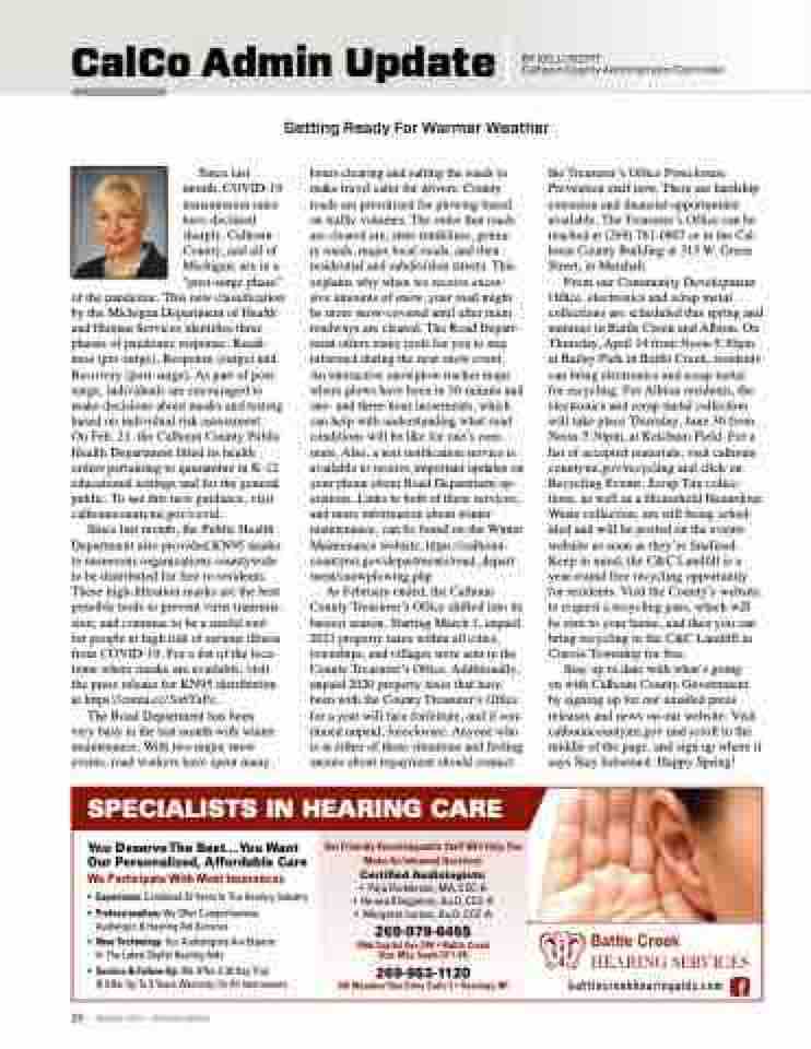 As February ended, the Calhoun County Treasurer’s Office shifted into its busiest season. Starting March 1, unpaid 2021 property taxes within all cities, townships, and villages were sent to the County Treasurer’s Office. Additionally, unpaid 2020 property taxes that have been with the County Treasurer’s Office for a year will face forfeiture, and if con- tinued unpaid, foreclosure. Anyone who is in either of these situations and feeling unsure about repayment should contact