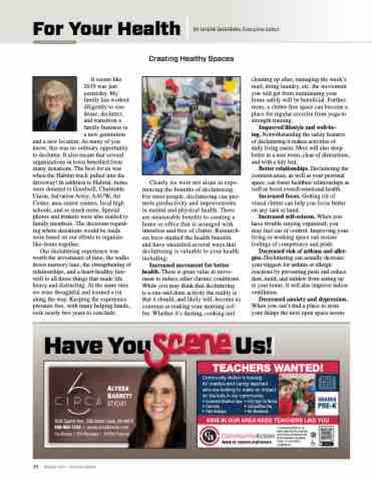 Clearly we were not alone in expe- riencing the benefits of decluttering. For most people, decluttering can pro- mote productivity and improvements in mental and physical health. There are measurable benefits to creating a home or office that is arranged with intention and free of clutter. Research- ers have studied the health benefits and have identified several ways that decluttering is valuable to your health including: