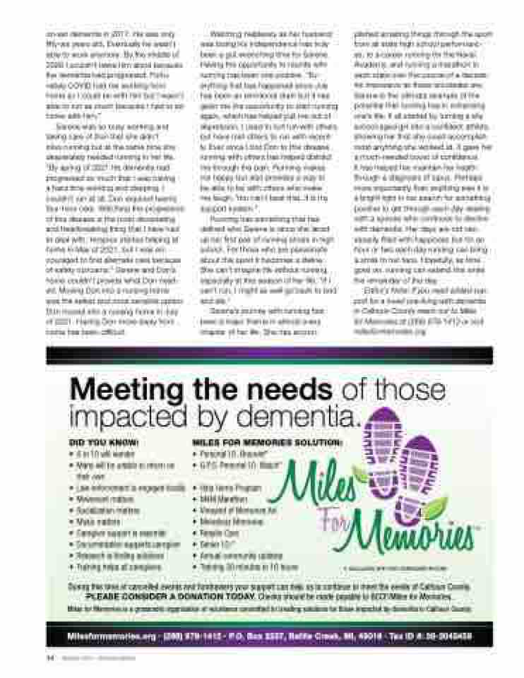 Editor’s Note: If you need added sup- port for a loved one living with dementia in Calhoun County reach out to Miles