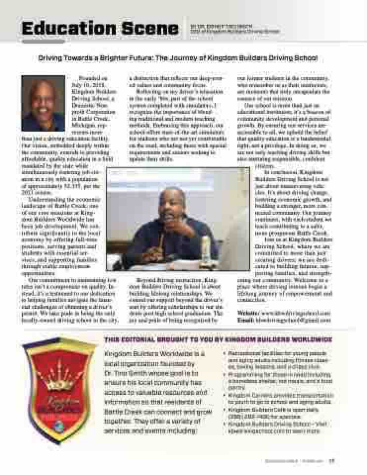 Founded on July 10, 2018, Kingdom Builders Driving School, a Domestic Non- profit Corporation in Battle Creek, Michigan, rep- resents more