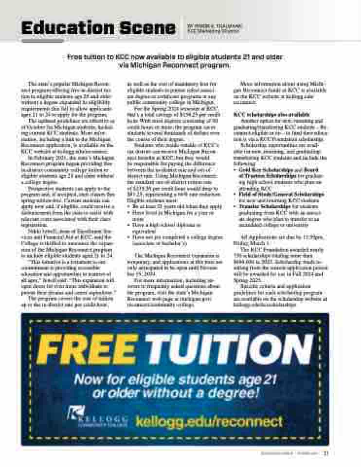 Nikki Jewell, dean of Enrollment Ser- vices and Financial Aid at KCC, said the College is thrilled to announce the expan- sion of the Michigan Reconnect program to include eligible students aged 21 to 24.