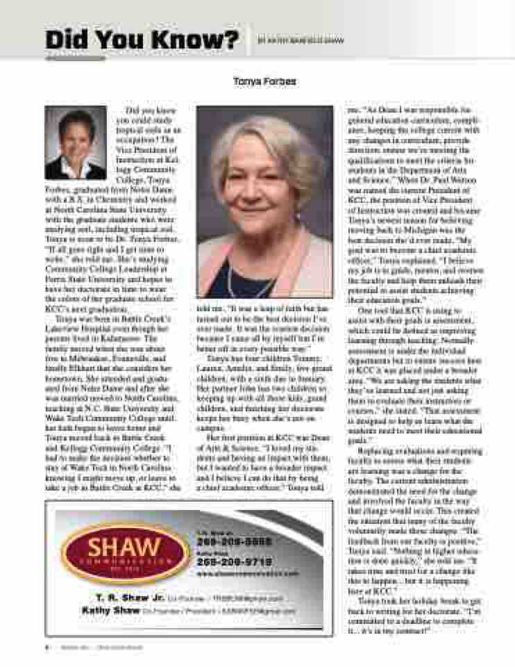 five to Milwaukee, Evansville, and finally Elkhart that she considers her hometown. She attended and gradu- ated from Notre Dame and after she was married moved to North Carolina, teaching at N.C. State University and Wake Tech Community College until her kids began to leave home and Tonya moved back to Battle Creek